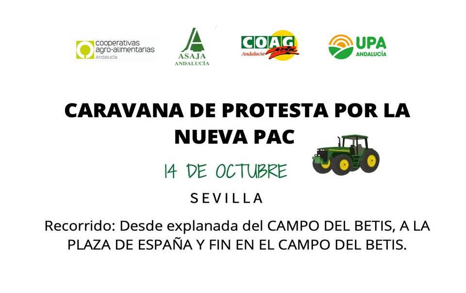 El sector agrario andaluz, representado por ASAJA, COAG, UPA y Cooperativas Agro-alimentarias de Andalucía, convoca a todos los agricultores y ganaderos de la región a una caravana, el próximo 14 de octubre en Sevilla, en defensa de una PAC justa para los agricultores y ganaderos de Andalucía y en protesta ante el incumplimiento de Luis Planas con la realidad y la diversidad productiva del campo andaluz. De no modificarse el Plan Estratégico Nacional esta protesta será la primera de un periodo de movilización permanente que no se paralizará hasta que se atienda y se reconozca el esfuerzo de nuestra región.