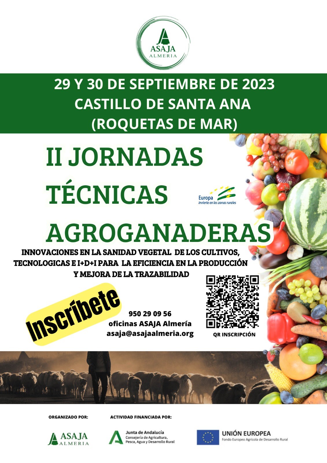 ASAJA-Almería pone voz a la agricultura y ganadería de la provincia de Almería en sus II Jornadas Agroganaderas, un evento bienal que se desarrollará durante dos intensas sesiones en las que se pondrá sobre la mesa la situación actual del sector agrario, las políticas que tienen incidencia en el mismo y las necesidades de los profesionales del campo. Un encuentro en el que además de información se ofrecerá la oportunidad a los agricultores y ganaderos para que participen planteando sus dudas e inquietudes. Tendrán lugar, en esta ocasión, en el Castillo de Santa Ana, en Roquetas de Mar, los días 29 y 30 de septiembre. Se desarrollará un intenso programa en horario de mañana y tarde, ambos días, abarcando todas las temáticas de máximo interés para el sector.
