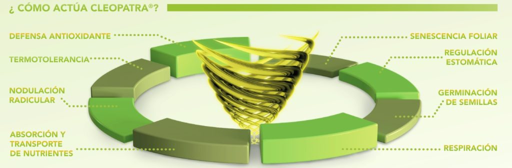 Los ensayos de campo realizados por FMC en distintos cultivos demuestran que la eficacia de Cleopatra® se basa en su acción sobre múltiples procesos fisiológicos esenciales para el crecimiento y la resiliencia de la planta, entre ellos: la defensa antioxidante, la termotolerancia, la nodulación radicular, la absorción y el transporte de nutrientes, la respiración, la germinación de semillas, la regulación estomática o la senescencia foliar.