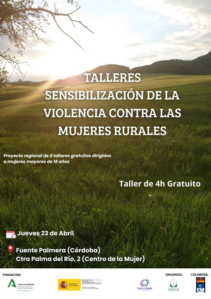 Te invitamos a participar en nuestros talleres gratuitos de sensibilización en el mundo rural, enfocados en la prevención y formación frente a la violencia contra las mujeres. El próximo se realizará el jueves, 23de abril en Fuente Palmera (Córdoba)